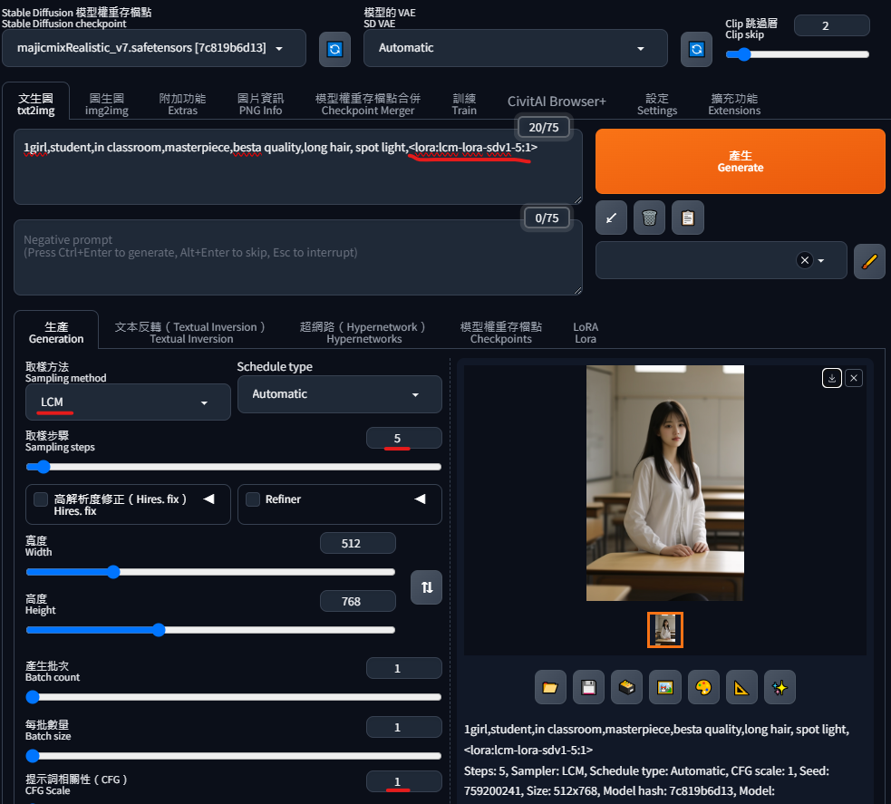 LCM 對一般出圖來說可能還好,但是如果是需出多張圖抽卡時,可先用LCM跑圖並微調,微調至差不多後再用一般方式出圖,來提升出圖效率